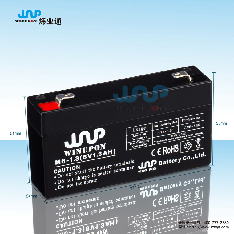 規(guī)格型號 | 6V1.3AH | 外形尺寸(±2mm) | 約重0.30KG | |||