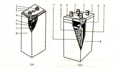 1一接線端子;2一蓋;3~安全閥;4一極柱;5一正極板;6一隔板;7一負(fù)極板;8--#b.殼;9一端子膠