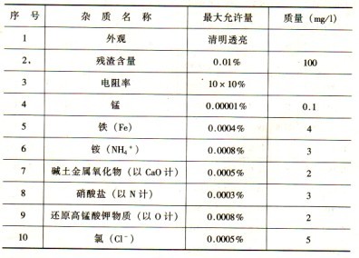 蓄電池用水的標(biāo)準(zhǔn),我國原第一機(jī)械工業(yè)部對蓄電池用水的要求見表l-3。表l-3中雜質(zhì)鐵、銨、氯等對鉛酸蓄電池危害較大,制造廠要從嚴(yán)要求。