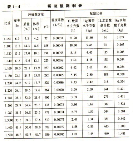 制取純水的方法有蒸餾法、陰陽樹脂交換法、電阻法、離子交換法等。因水中的雜質(zhì)是鹽類離子,所以水的純度用電阻率來表示。國內(nèi)制造廠主要用離子交換法制取。其總含鹽量小于lm9/l,水電阻率為(80~1000)×104Ω.mm(25 0C)。鉛酸電池電解液(稀硫酸)配制見表l-4。濃硫酸加入水稀釋,會(huì)發(fā)生體積收縮,故混合體積值應(yīng)適當(dāng)增大。