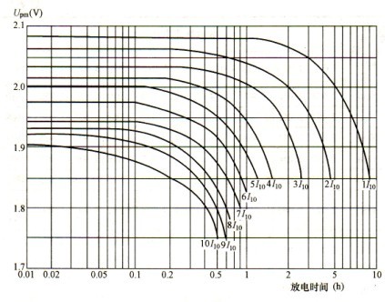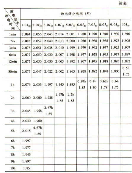 圖4—4閥控電池的放電特性曲線為增長(zhǎng)新粒子的結(jié)晶中心,以提高充電電流的效率。 5,10~10110放電曲線比1,10~4,l0放電初期端電壓和中期端電壓變化速率變化大,其原因是高放電率下的放電電流很大,電池極化作用隨電流增加而變大。 閥控電池不同倍數(shù)率的放電特性見(jiàn)表4—4。表4—4 閥控電池不同倍率的放電特性曲線表(25℃)