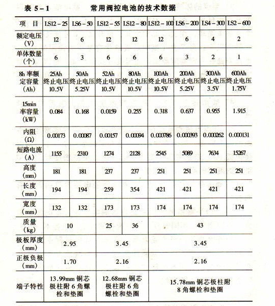 電池的內(nèi)阻就單體電池而言,主要由電解液、隔板和極板本身(極柵及活性物質(zhì))構(gòu)成。就電池組而言,單體電池之間的連接,以及極柱都是構(gòu)成電阻的重要部分,需進行電壓降的計算。有時為了減小電壓降的損失,而采用銅芯鍍鉛的極柱。常用閥控電池的技術(shù)數(shù)據(jù)見表5—1。