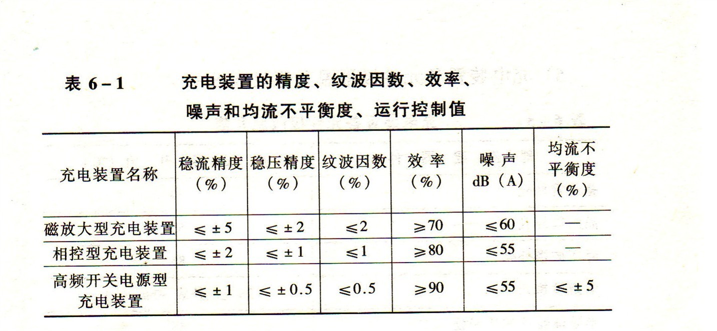 4)充電裝置的精度、紋波因數(shù)、效率、噪聲和均流不平衡度、運(yùn)行控制值,見(jiàn)表6-1.