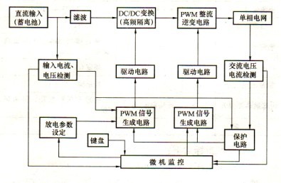 反向單相交流輸出,包含高頻直流變換電路和單相PWM整流逆變電路。高頻直流變換電路控制蓄電池恒流放電和起到與交流電網電氣隔離作用;PWM是將蓄電池釋放的能量反饋回電網。