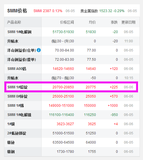 6月6日 鉛價(jià)再次上漲225元