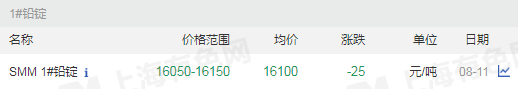 8月11日 周二 鉛價(jià)漲-25元/噸,均價(jià)16100元/噸